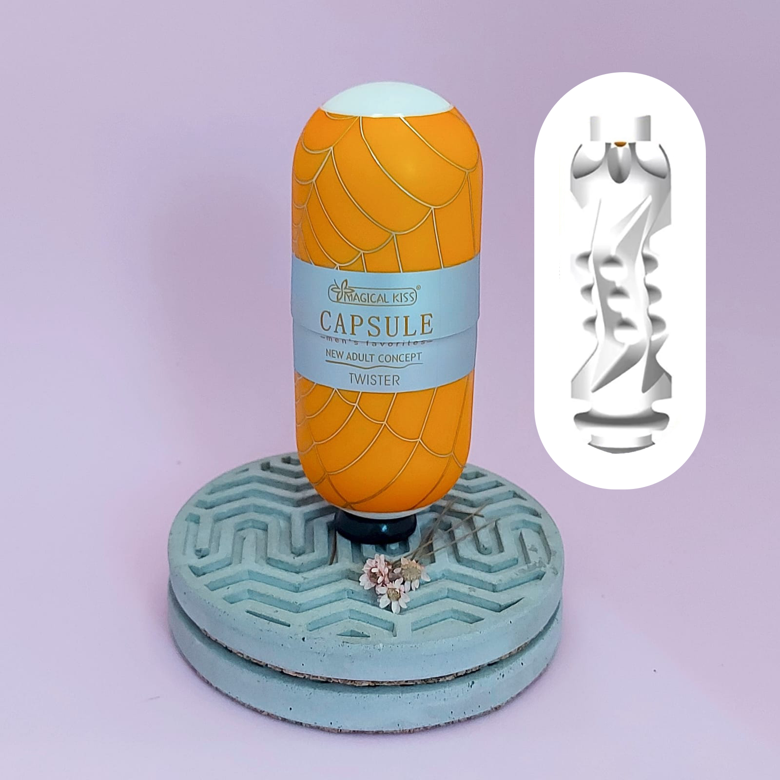 Dentro da embalagem em forma de casca, você encontra uma peça de silicone que imita uma capsula, porém, por dentro,