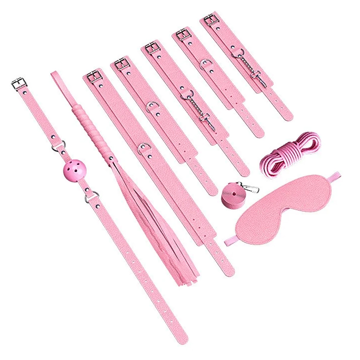 Kit bondage com 8 peças, sendo: Algema, Tornozeleira, Venda, Corda, Coleira e guia revestidas em couro sintético por fora e pelúcia por dentro.